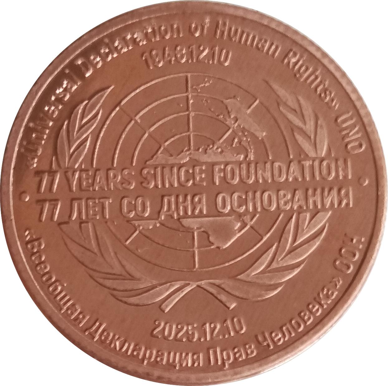 Аверс: Посередине изображение официальный символ (герб) ООН (Организация Объединённых Наций). Поверх герба ООН надпись на двух языках 77 лет со дня основания и 77 years since foundation. Выше герба ООН надпись 1948.12.10 (официальная дата создания Всеобщей Декларации Прав Человека). Ниже герба ООН надпись 2025.12.10 (дата создания монеты). Сверху полукругом надпись на английском языке «Universal Declaration of Human Right» UNO. Снизу полукругом надпись «Всеобщая Декларация Прав Человека» ООН.