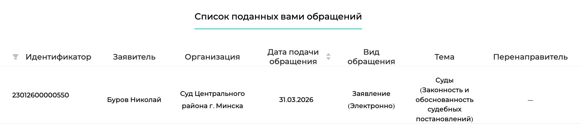21 марта 2026 года заявление было направлено в СУД ЦЕНТРАЛЬНОГО РАЙОНА ГОРОДА МИНСКА со всеми материалами и вопросами.
