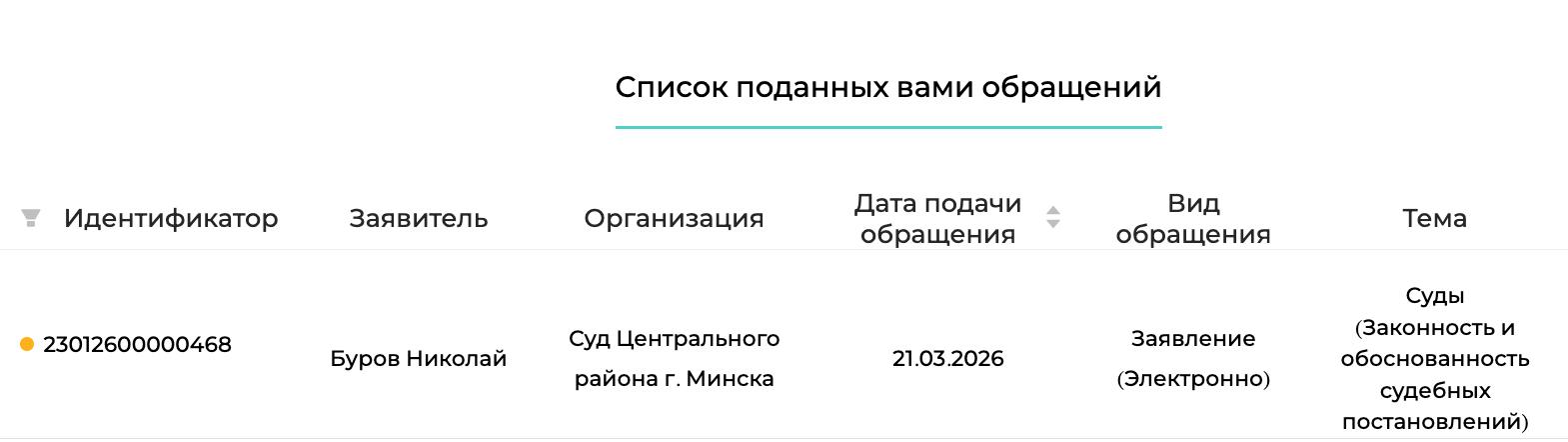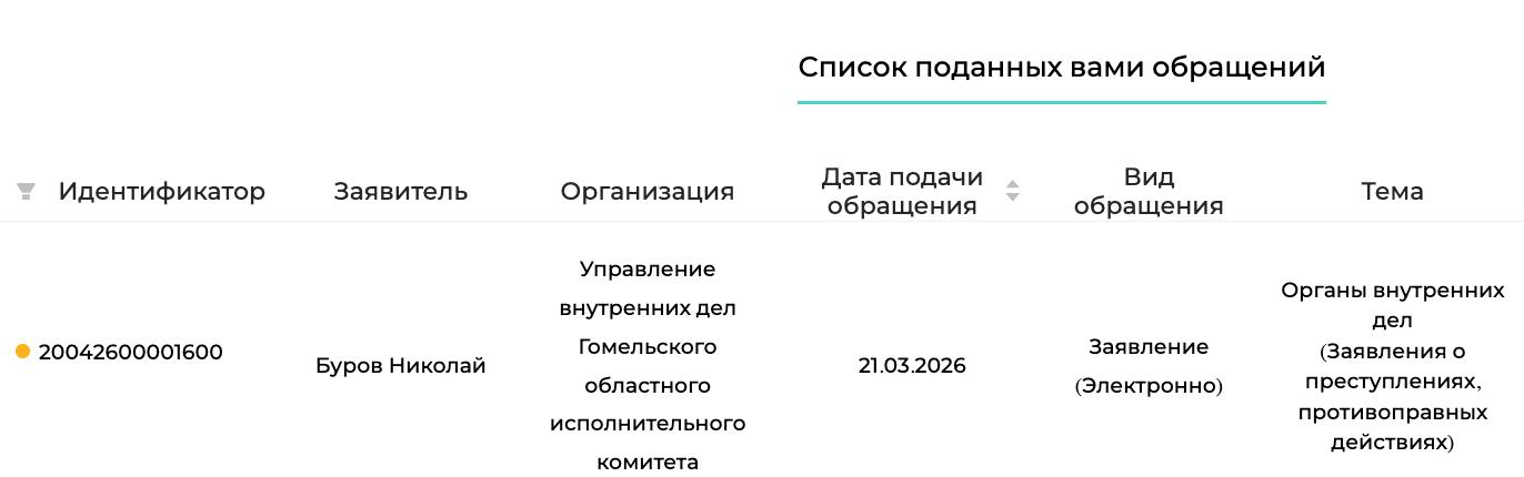 Заявление было отправлено 21 марта 2026 года через официальный сайт обращений и заявлений обращение.бел