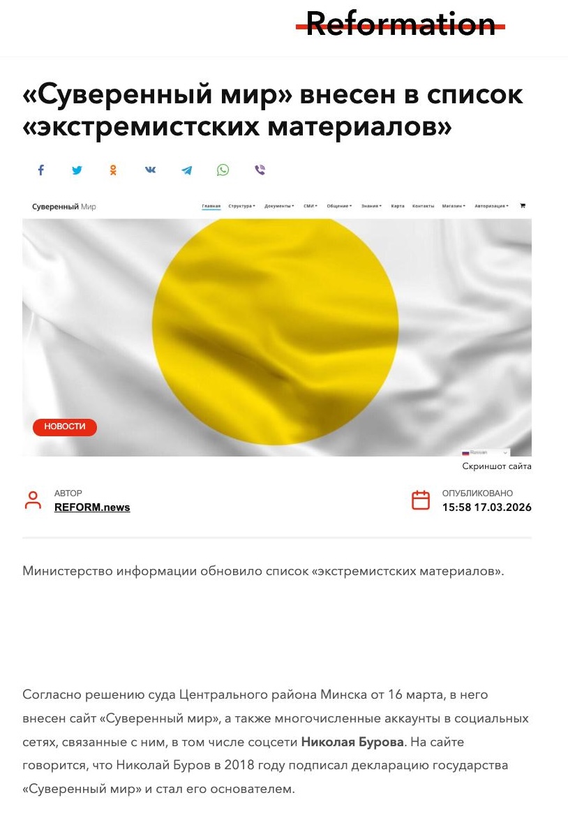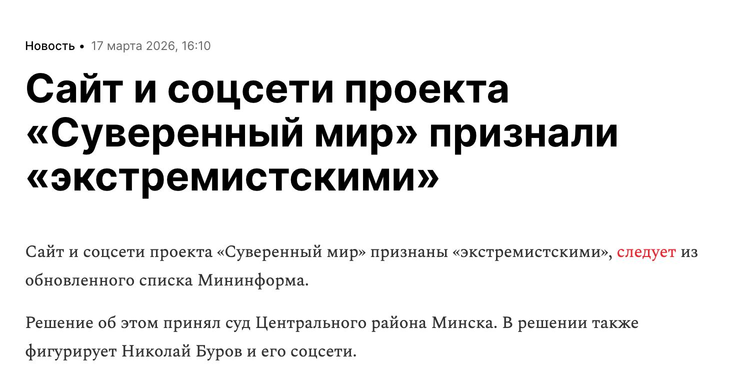 17 марта 2026 года различные оппозиционные каналы и СМИ опубликовали информацию о том, что информационные ресурсы «Суверенного Мира» внесли в список экстремистских материалов в РЕСПУБЛИКЕ БЕЛАРУСЬ.