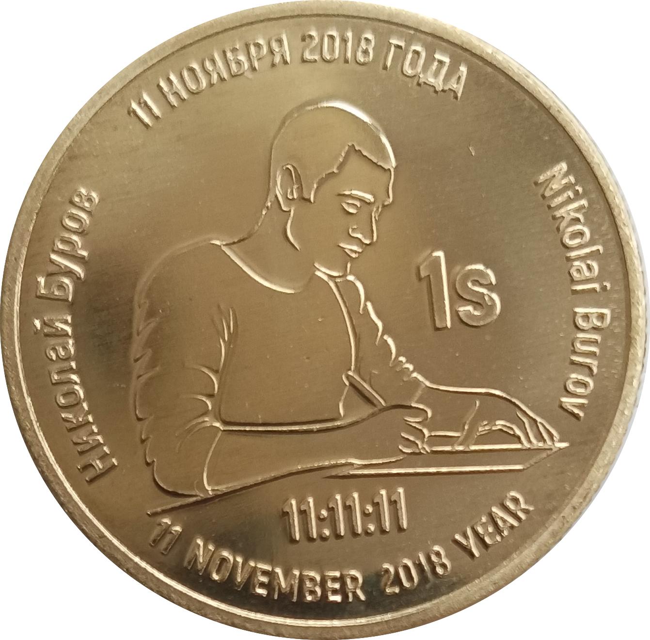 Аверс: Посередине изображён Николай Буров, который подписывает Декларацию о создании государства «Суверенный Мир». Сверху надпись, указывающая на день создания государства, путём публичного подписания декларации 11 НОЯБРЯ 2018 ГОДА. Снизу надпись, указывающая на день создания государства, путём публичного подписания декларации на английском языке 11 NOVEMBER 2018 YEAR. Слева полукругом указано имя Николай Буров на русском языке (кирилицей). Справа полукругом указано имя Nikolai Burov на английском языке (латинскими буквами). Правее от центра монеты указан номинал монеты 1S. Снизу под декларацией указано число 11:11:11 — это время подписания декларации 11 часов 11 минут и 11 секунд.