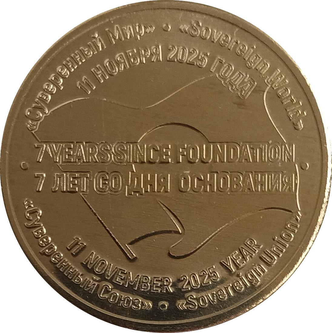 Реверс: Посередине изображен «Флаг «Суверенного Мира» официальный символ Государства. Поверх флага по центру надпись на двух языках 7 YEARS SINCE FOUNDATION и 7 ЛЕТ СО ДНЯ ОСНОВАНИЯ. Выше флага надпись 11 НОЯБРЯ 2025 ГОДА (дата создания монеты) на русском языке (кирилицей). Ниже флага надпись 11 NOVEMBER 2025 ГОДА (дата создания монеты) на английском языке (латинскими буквами). Сверху слева направо полукругом надпись на русском и английском языках «Суверенный Мир» «Sovereign World». Снизу полукругом надпись второго названия государства «Суверенный Союз» «Sovereign Union» также на двух международных языках.
